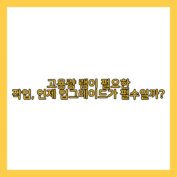고용량 RAM 업그레이드는 작업의 성격에 따라 필수적입니다. 특히 데이터 분석, 비디오 편집, 3D 모델링 및 고사양 게임과 같은 작업에서는 성능 차이가 뚜렷하게 나타납니다. 예를 들어, 데이터 분석의 경우, 수백만 개의 데이터 포인트를 처리하는 데 필요한 메모리가 충분하지 않을 경우, 분석 속도가 현저히 느려지거나 프로그램이 중단될 수 있습니다. 이러한 경우 최소 16GB 이상의 RAM이 요구될 수 있으며, 32GB 이상일 경우 더욱 원활한 작업이 가능합니다.